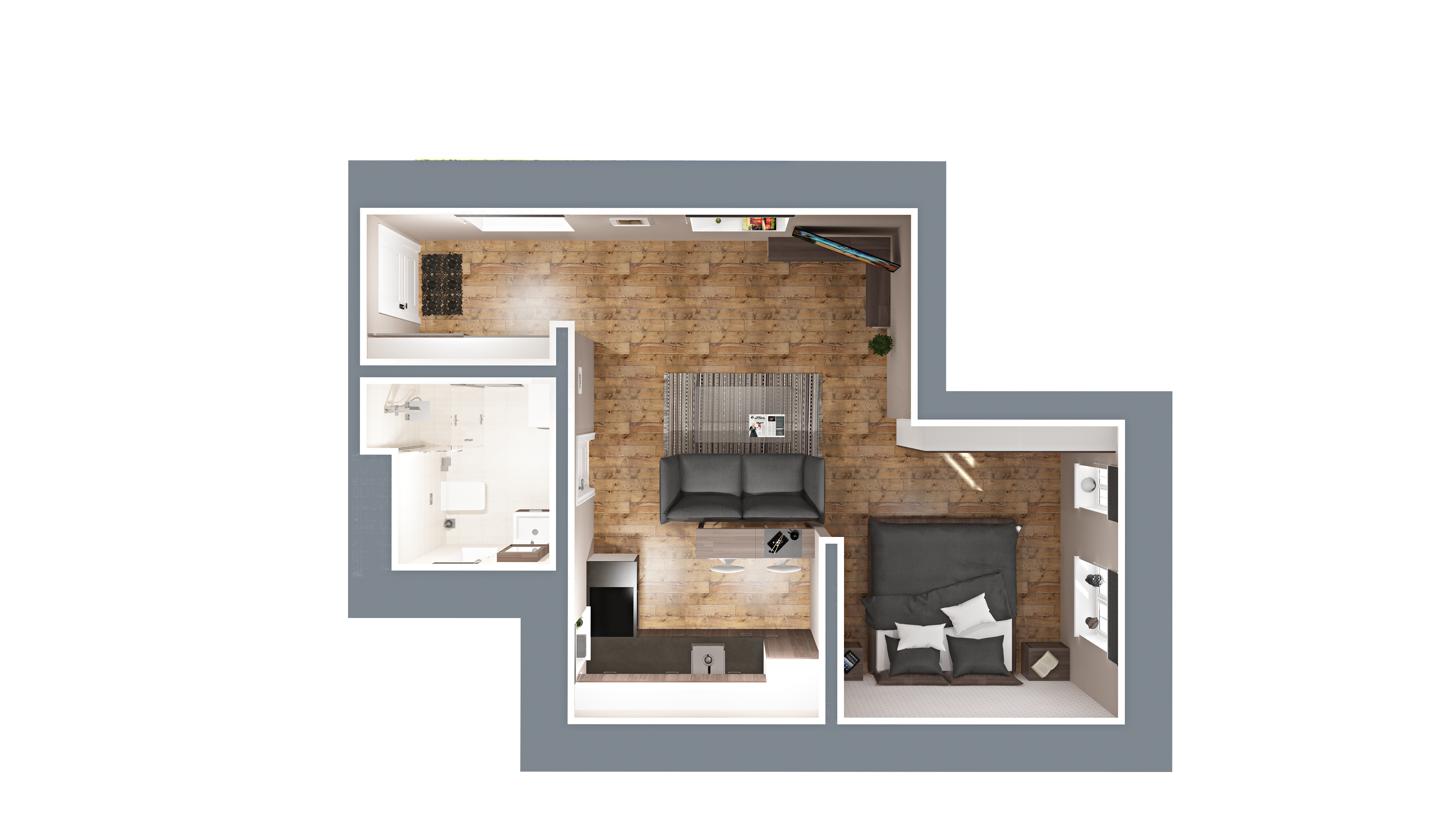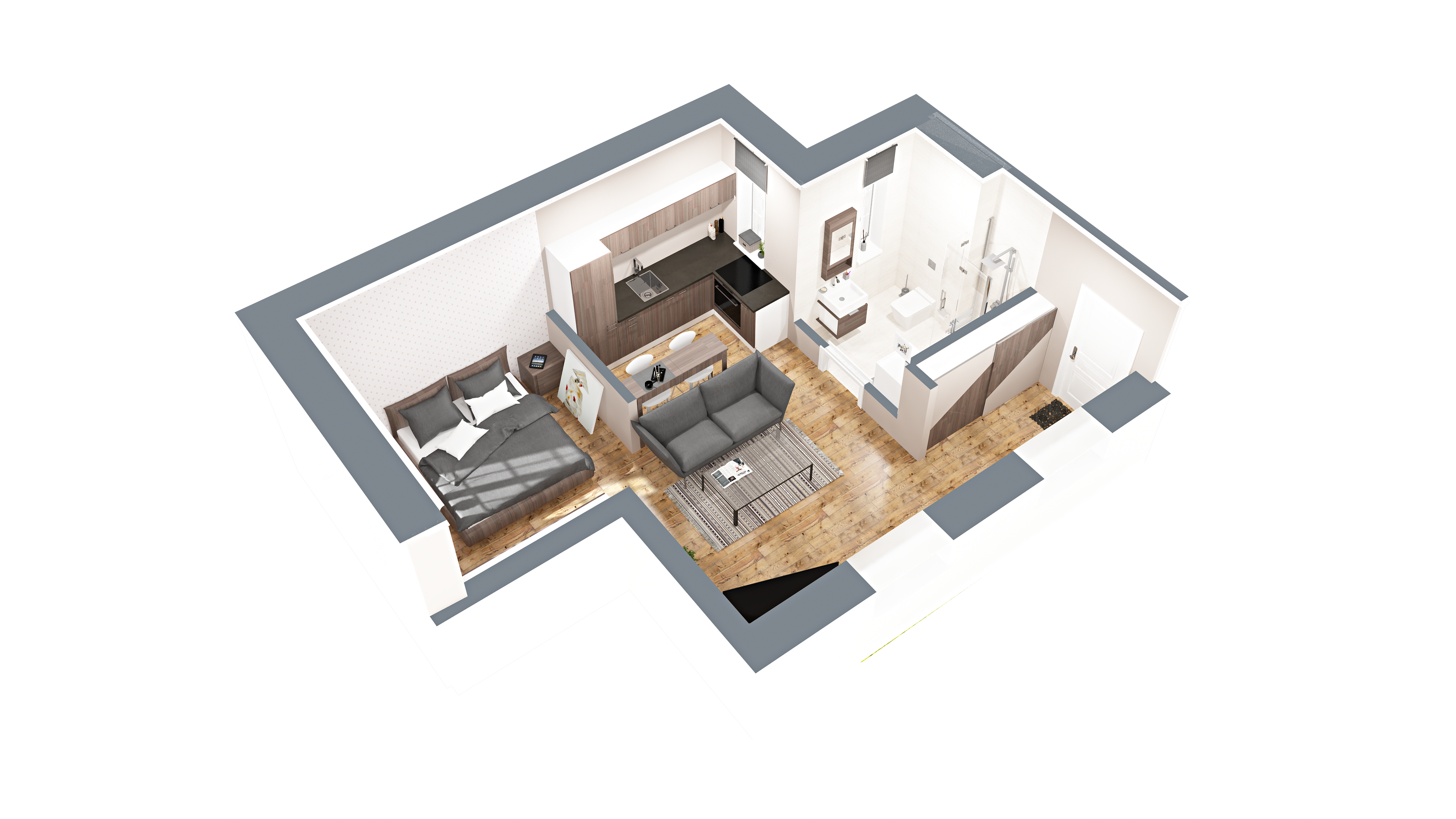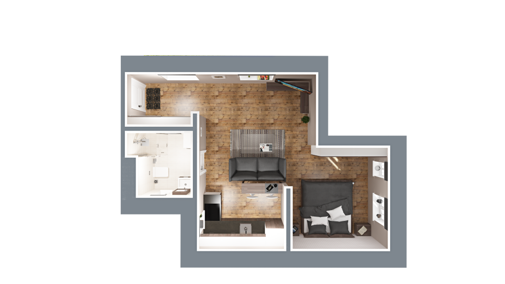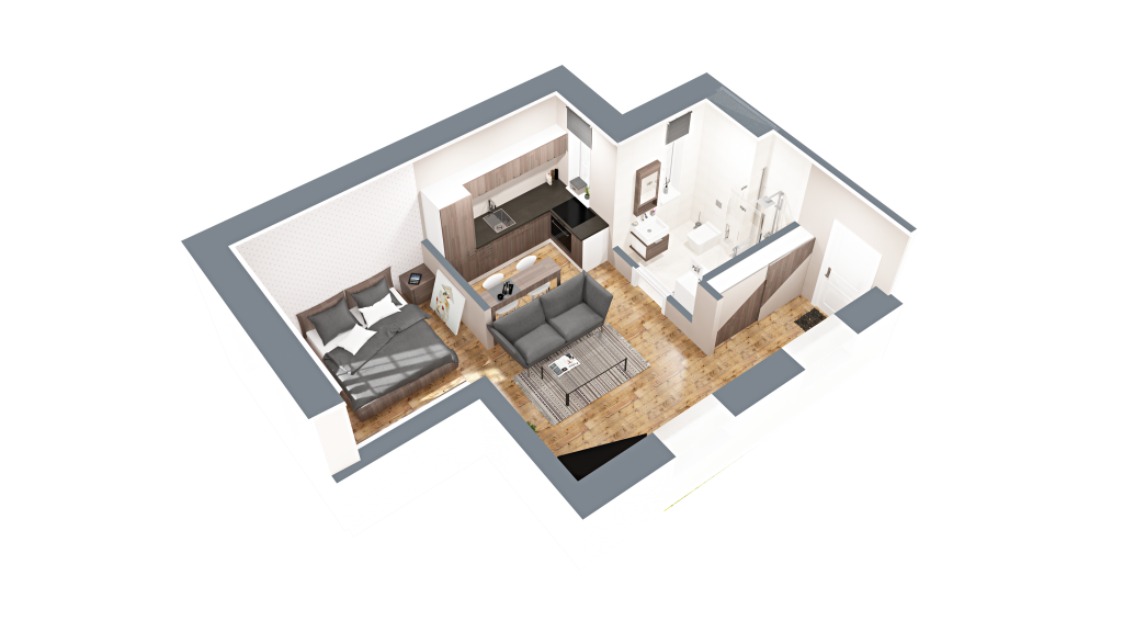 Vizuálna ukážka nepredstavuje presný stav bytu pri odovzdaní, slúži pre vašu lepšiu predstavu možnosti zariadenia a dizajnu bytu