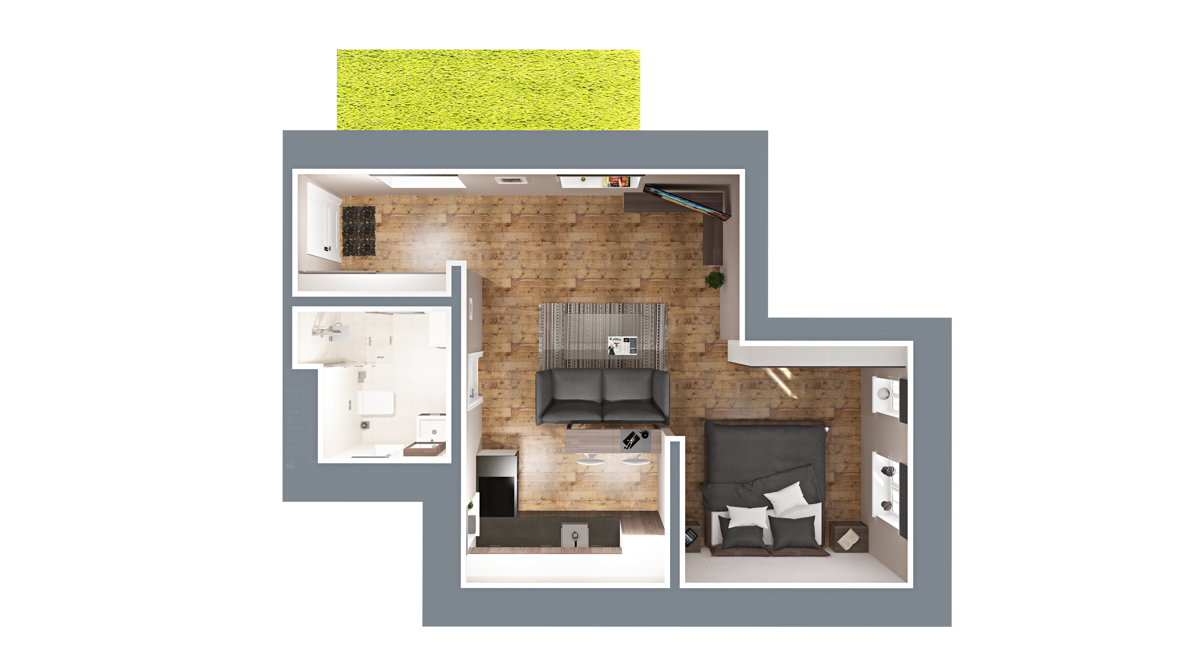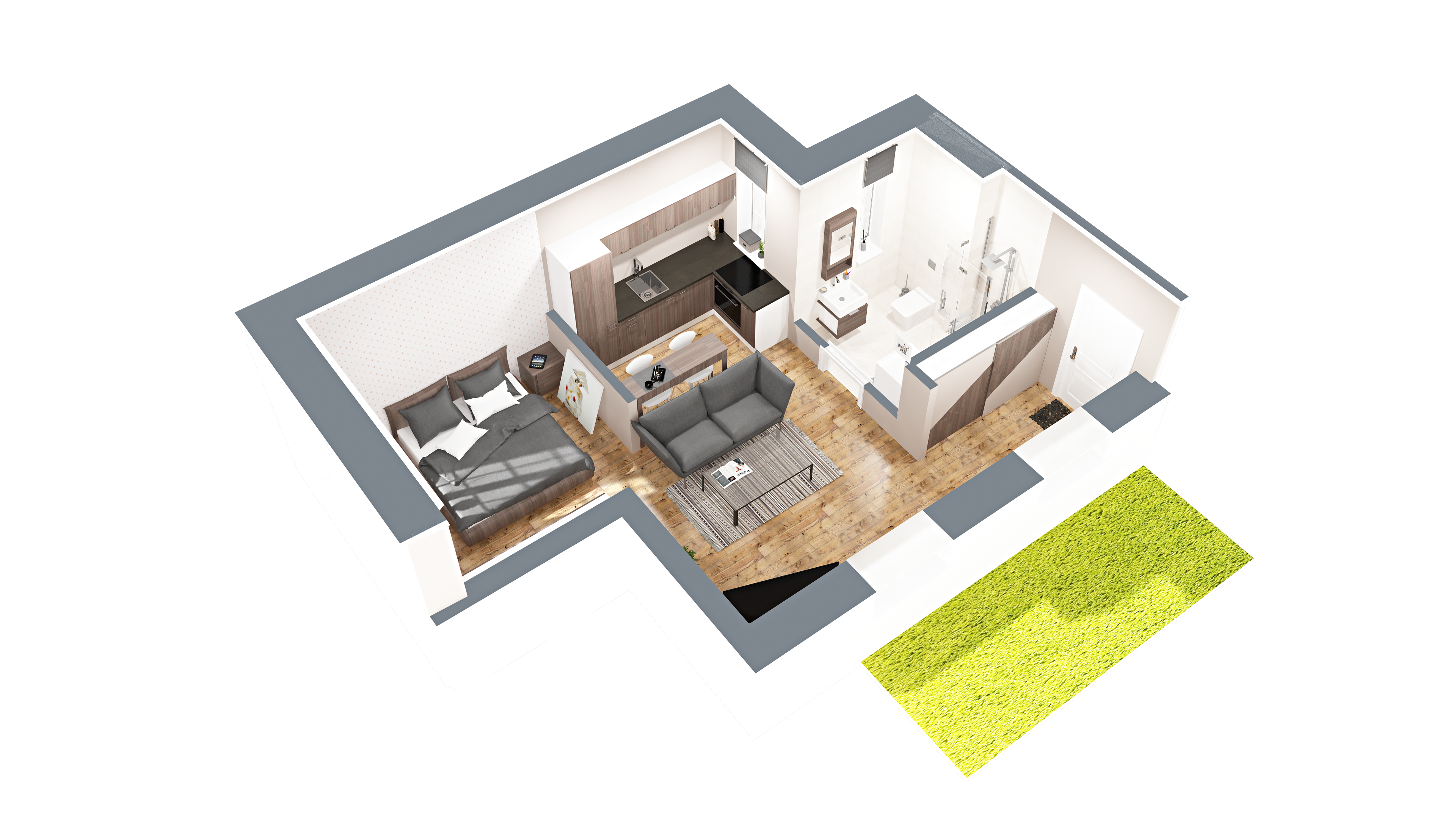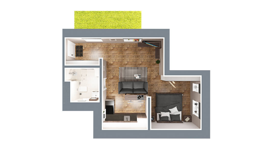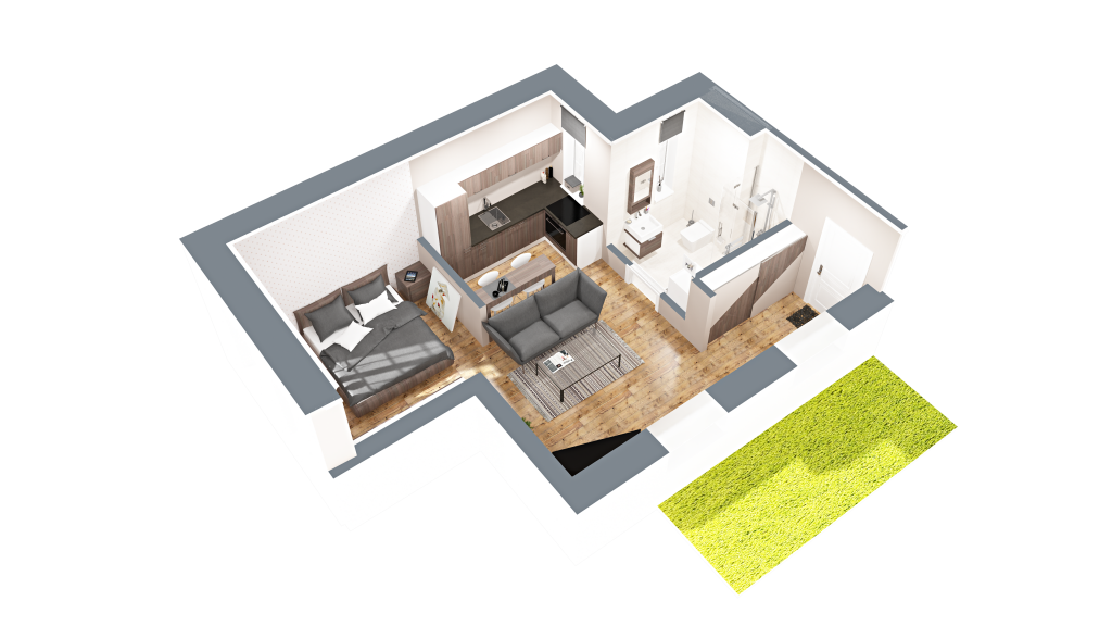 Vizuálna ukážka nepredstavuje presný stav bytu pri odovzdaní, slúži pre vašu lepšiu predstavu možnosti zariadenia a dizajnu bytu