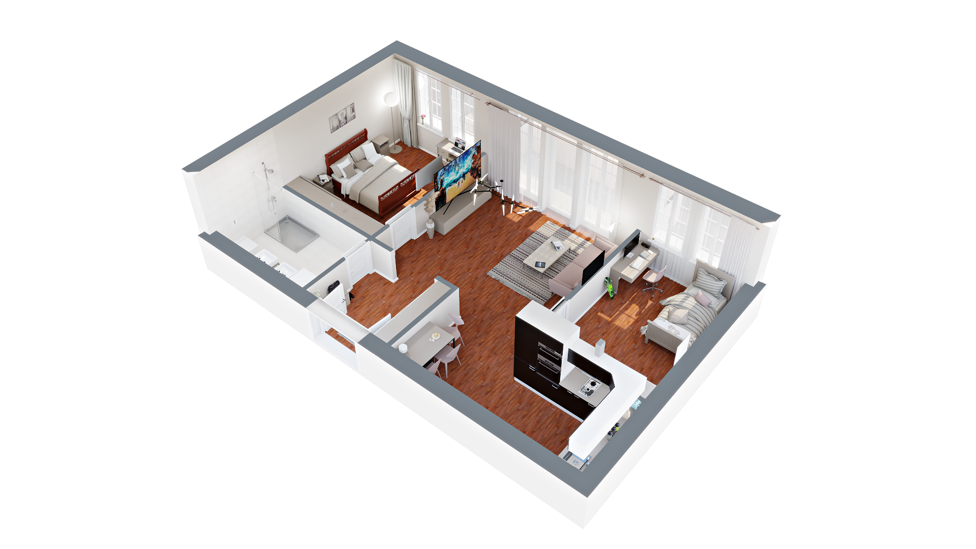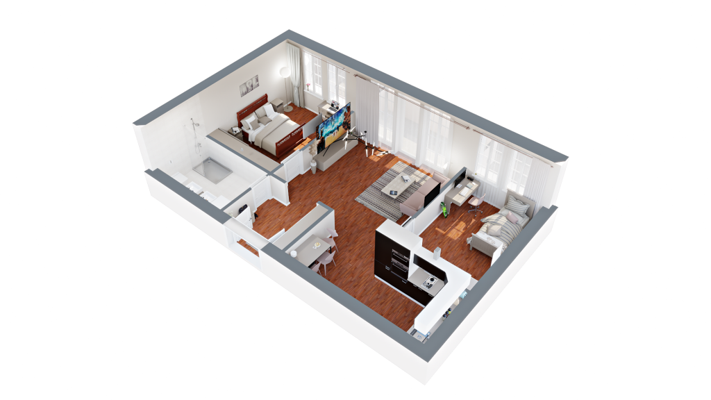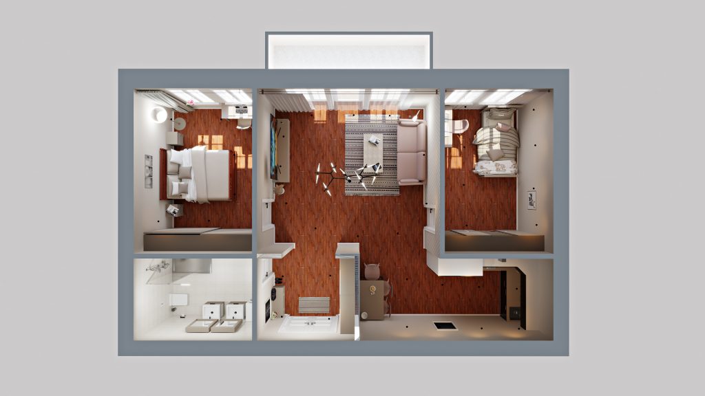 Vizuálna ukážka nepredstavuje presný stav bytu pri odovzdaní, slúži pre vašu lepšiu predstavu možnosti zariadenia a dizajnu bytu